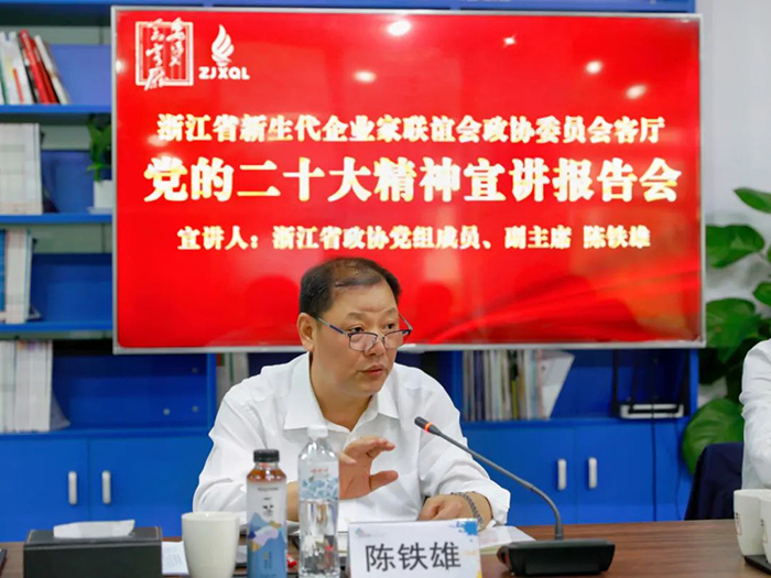 陳鐵雄副主席講述了黨的二十大會議的重要性,他提到:學(xué)習(xí)貫徹黨的二十大精神, 一要學(xué)明白,深刻認(rèn)識過去5年工作和新時代10年偉大變革的不平凡,堅定擁護(hù)“兩個確立”、堅決做到“兩個維護(hù)”不含糊,肩負(fù)起新時代新征程黨的使命任務(wù)不懈怠。二是悟明白, 把握好二十大精神的核心要義,要領(lǐng)會好“三個務(wù)必”,理解好“兩個結(jié)合”,準(zhǔn)確把握認(rèn)識兩個“答案”,深刻把握“六個堅持”和“五大重大原則”。三是干明白,要找準(zhǔn)發(fā)展的定位,準(zhǔn)確把握浙江高質(zhì)量發(fā)展建設(shè)、共同富裕示范區(qū)的使命責(zé)任,做有理想、敢擔(dān)當(dāng)、能吃苦、肯奮斗的新時代好青年,在推進(jìn)高質(zhì)量發(fā)展中有新的作為,堅持團(tuán)結(jié)奮斗。