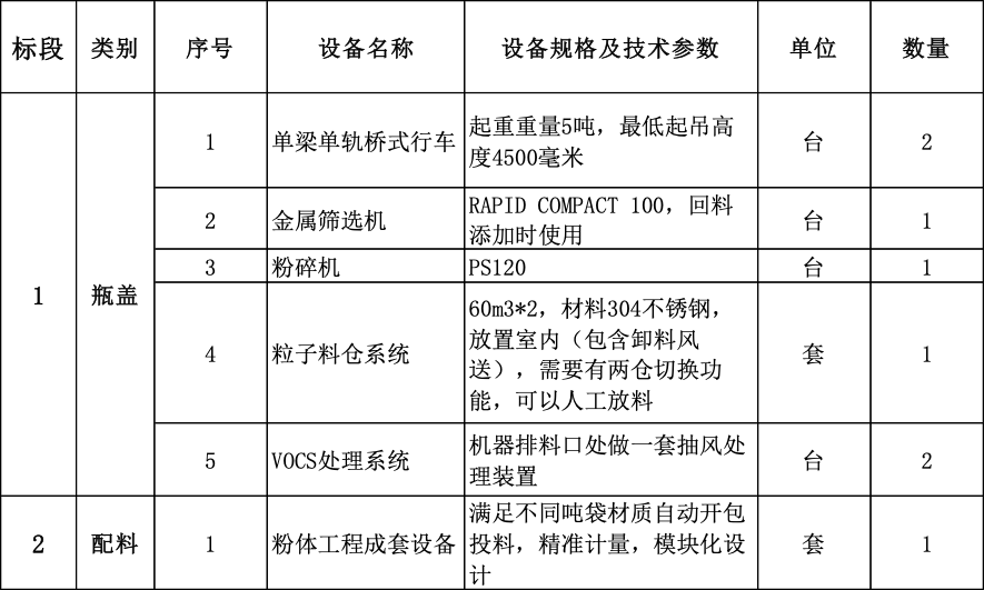 本次宏勝飲料集團(tuán)杭州蕭山智能化工廠項(xiàng)目瓶蓋與配料標(biāo)段設(shè)備需求見(jiàn)下表,內(nèi)容包括設(shè)備供應(yīng)、指導(dǎo)安裝調(diào)試和售后服務(wù)等。詳細(xì)需求待報(bào)名且審核通過(guò)后與相應(yīng)技術(shù)部門(mén)對(duì)接。