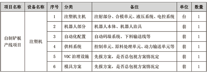 本次浙江迅爾物流控股集團自建鏟板產(chǎn)線項目需求見下表,內(nèi)容包括設備供應、指導安裝調(diào)試和售后服務等。詳細技術參數(shù)待報名且審核通過后與相應技術部門對接。